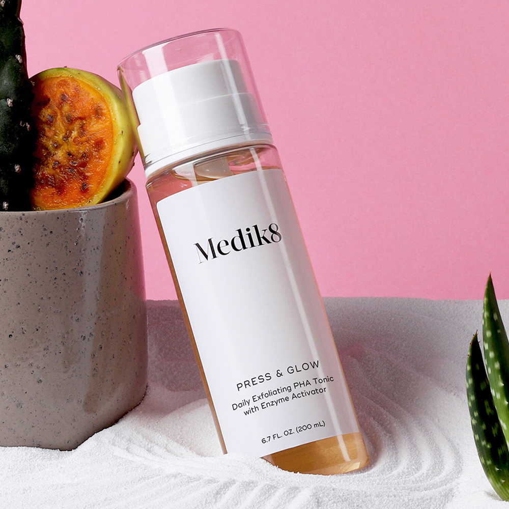 The Medik8 Press & Glow delivers its formula using a handy pump action. The powerful formula of 5.5% gluconolactone provides the skin with both exfoliation and hydration. Blended with another exfoliant, prickly pear plant, the toner helps support the skin’s natural cell turnover for a more radiant and luminous effect.